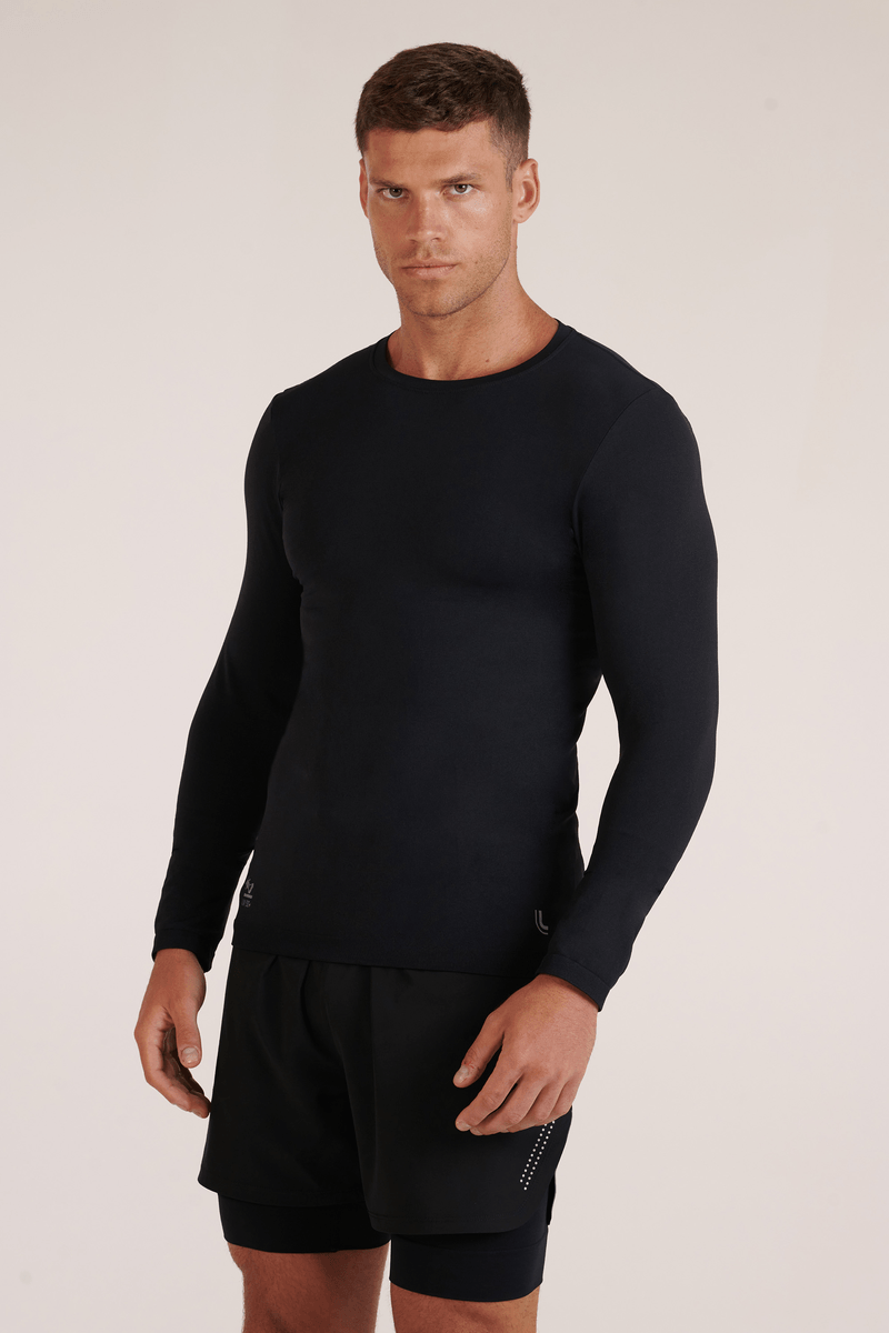 Blusa de manga longa, gola redonda, justa ao corpo para uso como segunda pele.